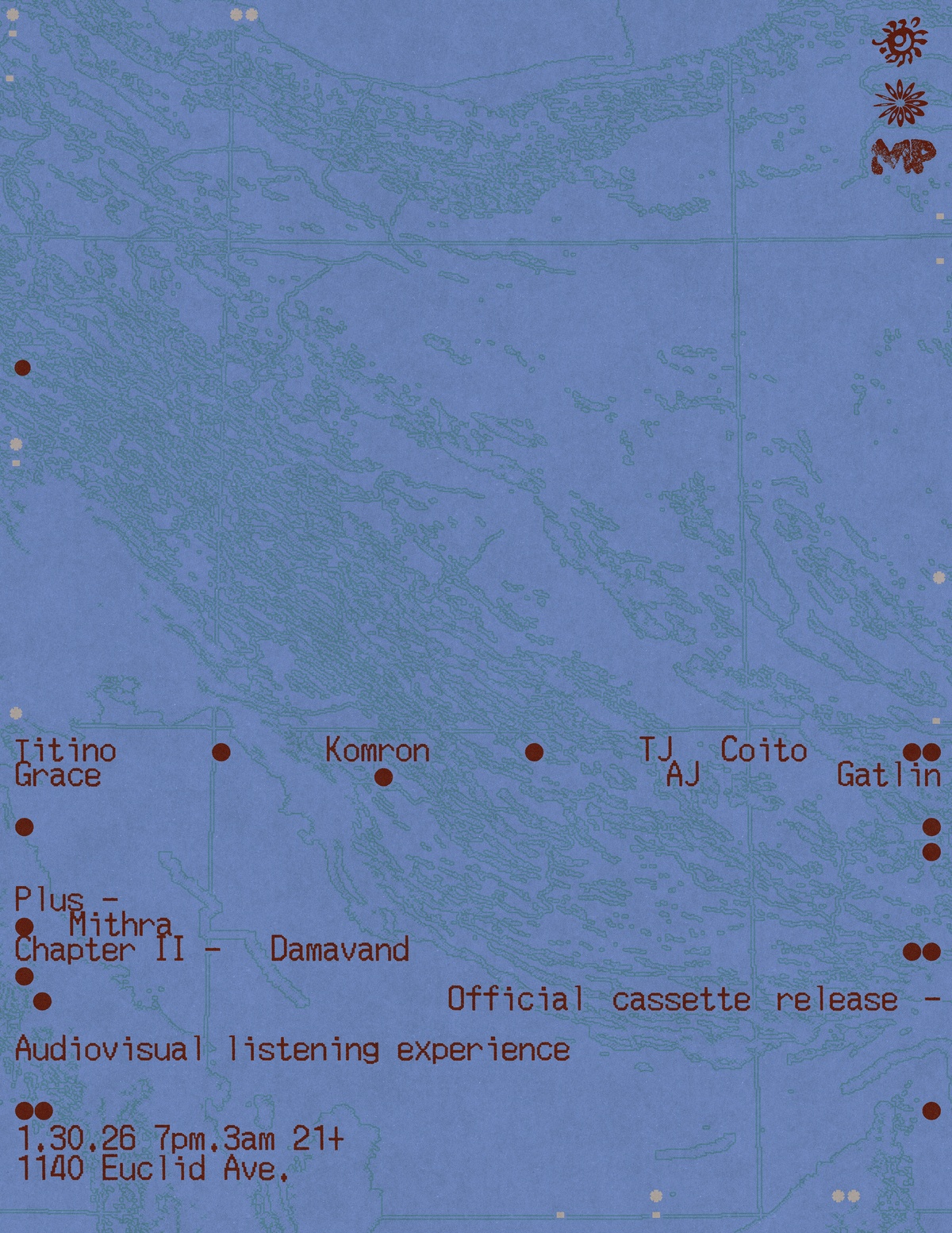 A night designed as a continuous arc from listening to dancefloor. Bloom, Mithra, and Mounting Pressure open with an audio visual cassette listening experience celebrating Mithra Tape Series Chapter 2: Damavand, played straight from the physical tape through Bloom's tri amped, tuned Altec A7 VOTT system, with visuals curated by Emil.