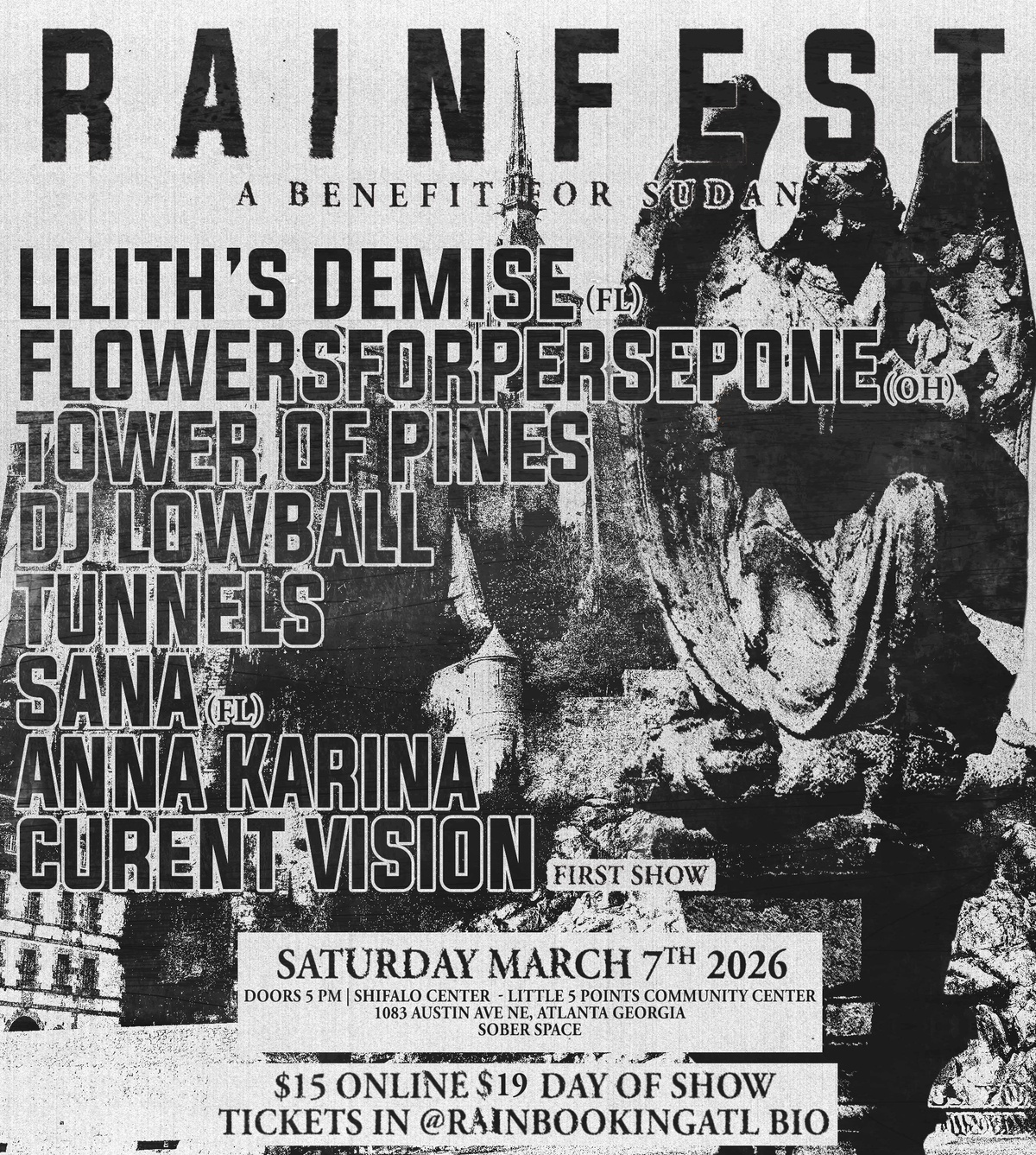 Rain Fest- all proceeds go to Sudan. Lilith’s Demise, flowersforpersephone, Dj Lowball, Sana, Tunnels, Towers of Pines, Anna Karina, Current Vision (first show) $15 Online, $19 At doors.